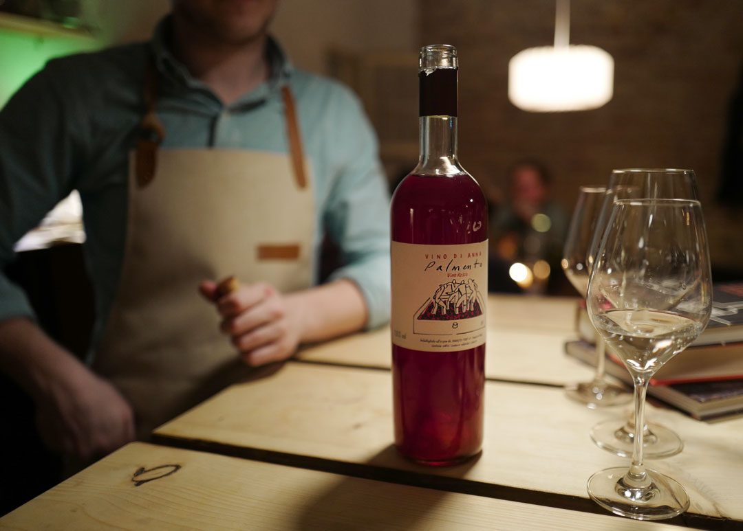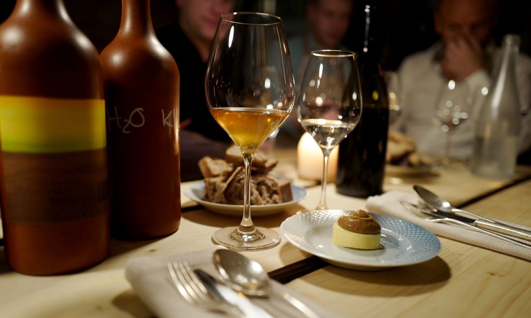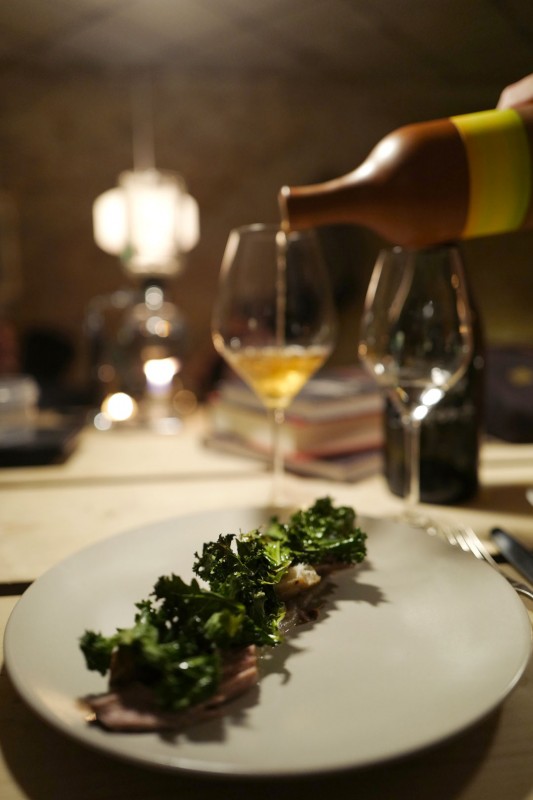 Men Erik og jeg er der for mat og vin. Vi får anbefalt en super oransjevin fra Østerrike fra Sepp & Maria Muster Erde 2013. Den kommer i en fabelaktig steingodsflaske om etter vårt besøk vil ende opp som vannflaske i restauranten. Vi har allerede sett et par av dem rundt på bordene fylt med vann fra egen tappekran.