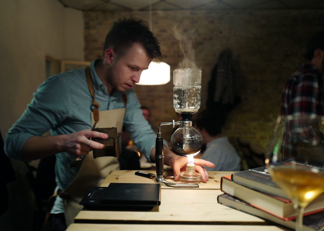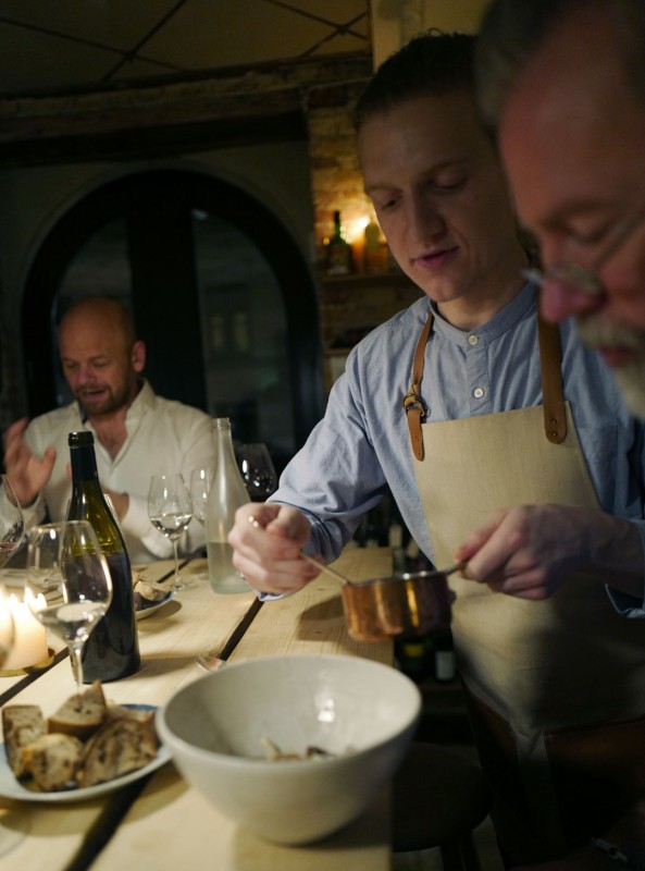 Vi har vin i glasset og maten er på vei. Nå har vi det som plommen i egget og Patrick er den perfekte vert der han svinser mellom bordene og skjenker vin. Litt til seg selv for å smake og så i glassene til gjestene. Han brygger kaffe – både Chemex og shifon.
