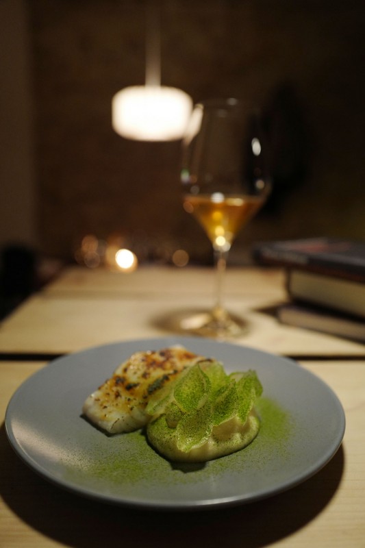 Neste rett er misostekt torsk med glatt selleripuré og syltet løk med persillepulver. Fisken er superdelikat og minner om klippfisk i konsistensen. Den er perfekt tilberedet. Det er også tilbehøret. Her er det ikke mange komponenter, men alt funker. Den deilige søte og umamirike misoen er påført torsken med et delikat penselstrøk. Så er den brent forsiktig.
