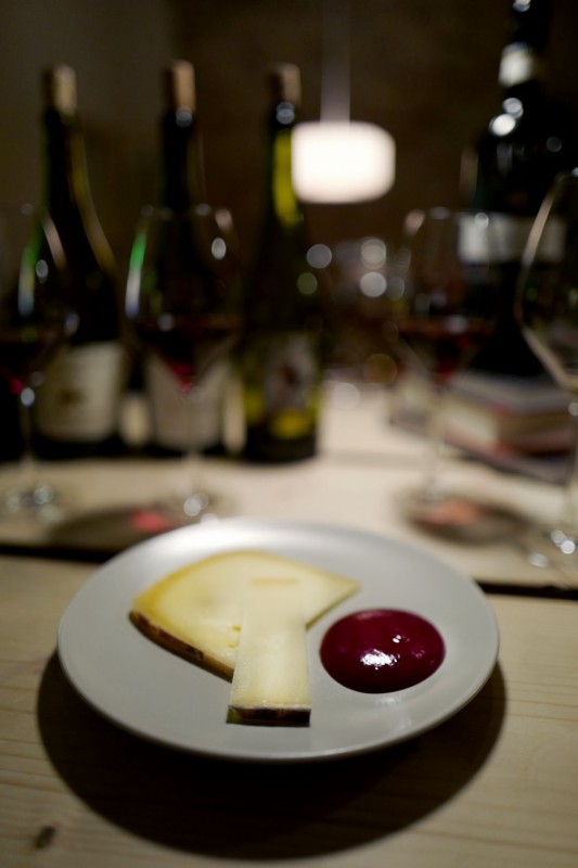 Osten kommer inn og det er en ufattelig deilig ost: Vesterhavsost med tyttebærsaus. Kuosten er karamellaktig og kan ligne på en fransk Comté. Hvilken vin var best til? Alle gikk ned på høykant, men vi holdt nok en knapp på outsideren. Men når det er sagt var det med osten separat. Med tyttebæret var det en av Côtes du Rhône-vinene som passet best. Morsom øvelse.