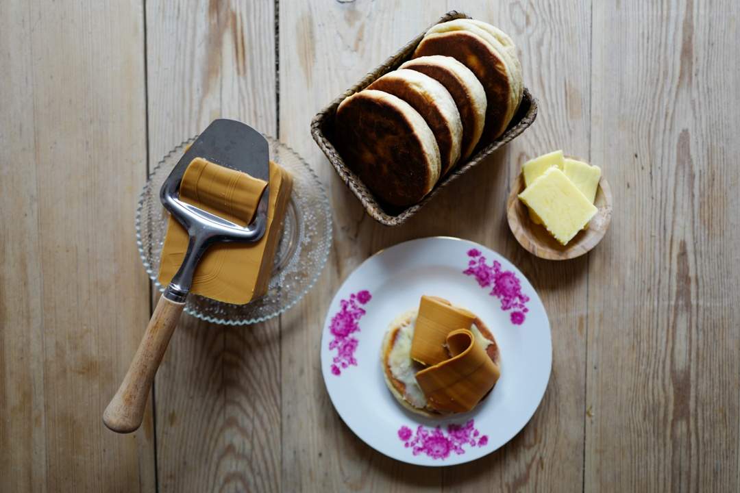Deigen kjevles ut og så stikker man ut sirkler som da stekes i tørr panne eller på takke. De smaker fantastisk med et tykt lag rørossmør og brunost. Rømme og syltetøy er også et godt alternativ.