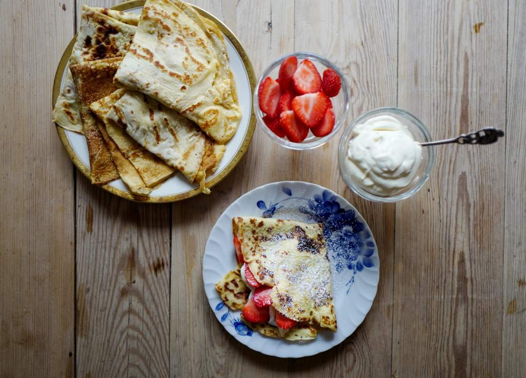 Franske tjukkmjølkspannekaker (crêpes) med jordbær og pisket rørosrømme