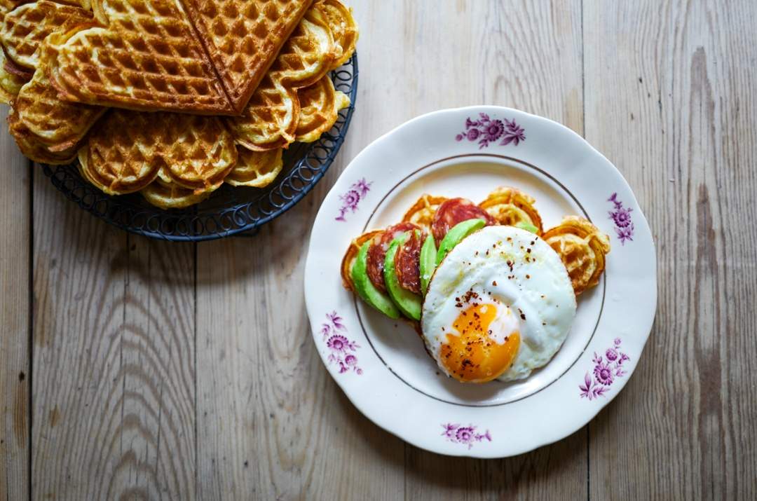 Tjukkmjølksvafler med avocado, spekepølse og egg