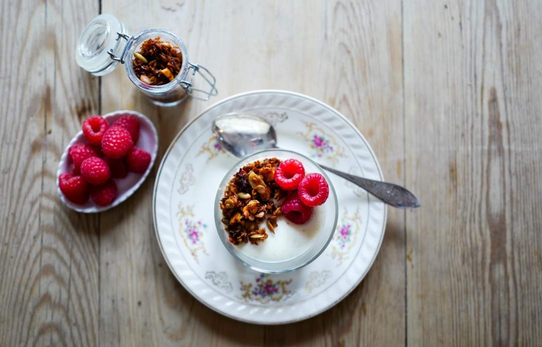 Dette er altså så godt! Det er en perfekt helgefrokost, men også dessert. Jeg har laget min egen granola med kokos, frø, honning, nøtter og havregryn. Det tar ingen tid å lage selv, så lag en stor porsjon slik at du har til yoghurten din eller til tjukkmjølk. Tjukkmjølkspuddingen er perfekt å lage på kvelden slik at du har ferdig satt pudding til frokost.
