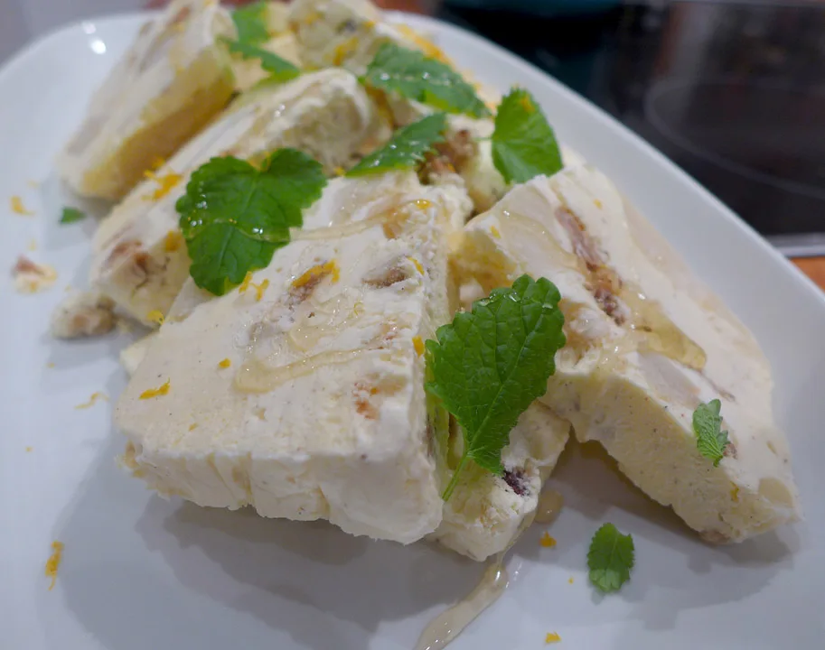 Ta ut formen fra fryseren fem minutter før servering. Skjær i tykke skiver og hell litt god honning over , riv appelsinskall og server med sitronmelisseblader på toppen.