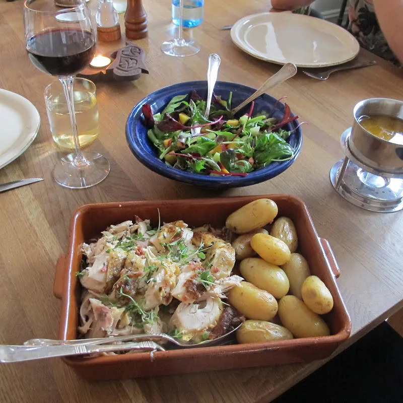 Stek kyllingen uten lokk på 230 g i 15 minutter. Sjekk med en spiss kniv at kyllingen er ferdigstekt. Stikk kniven innerst ved lårbeinet. Er kraften blank, er kyllingen ferdig.