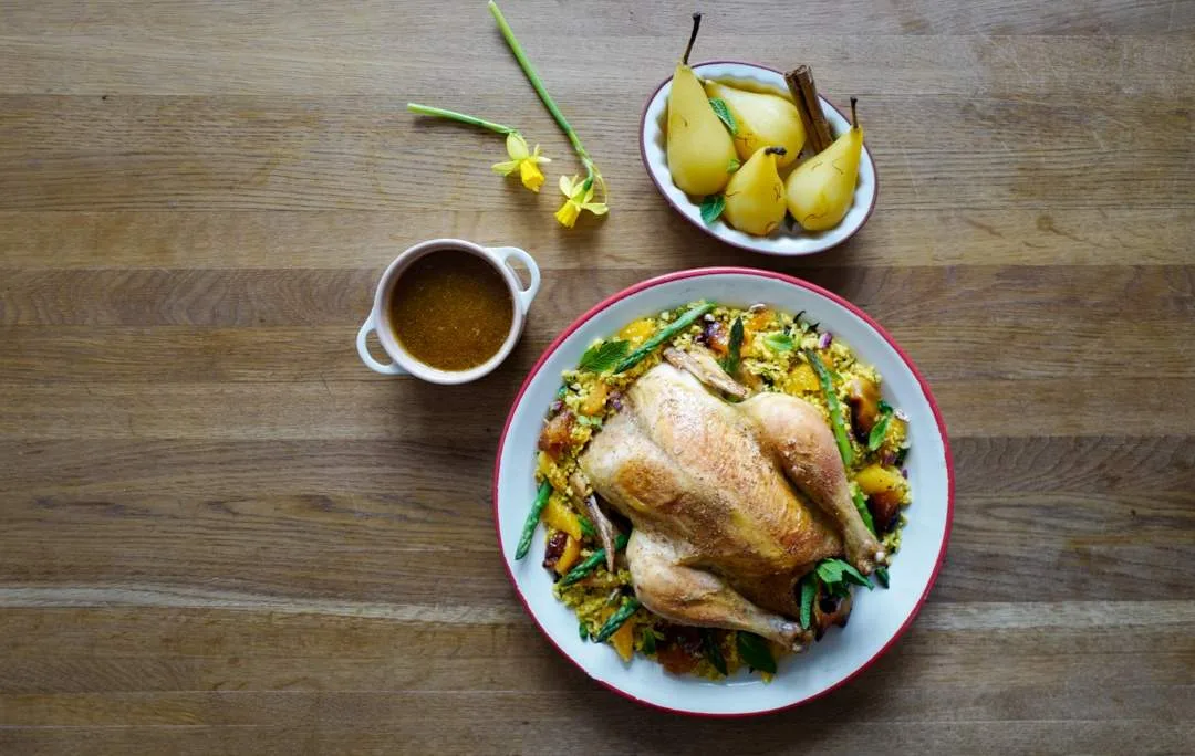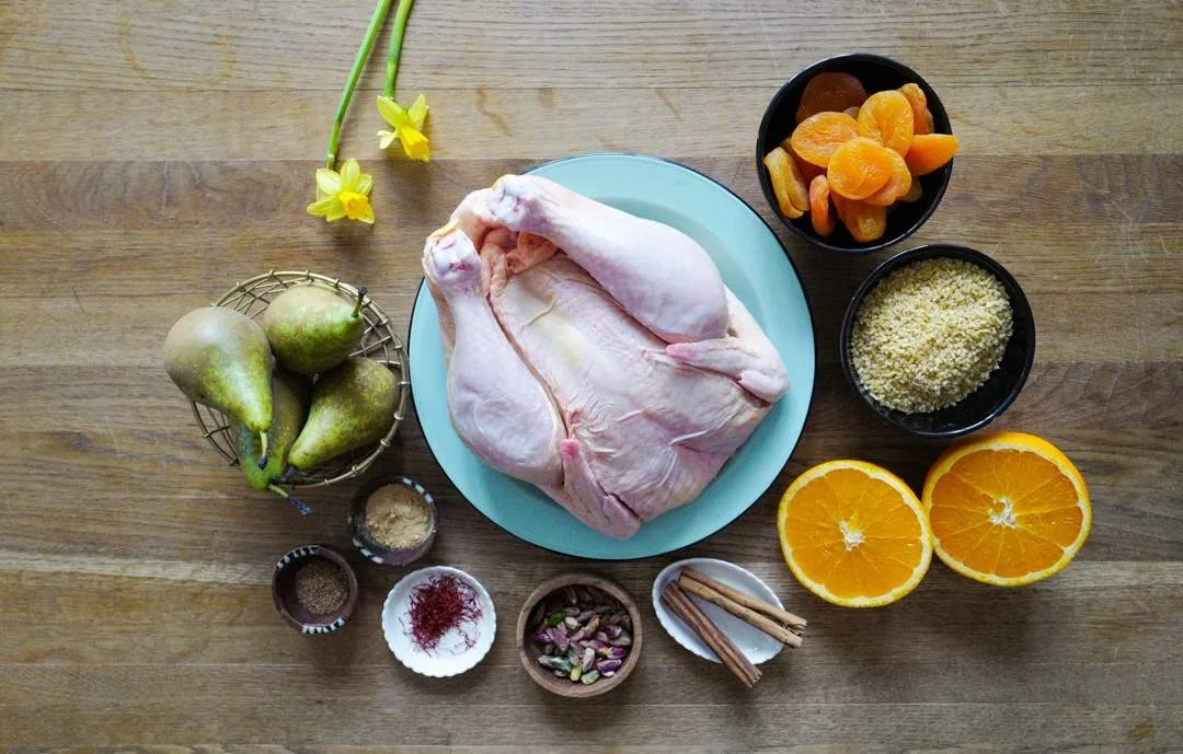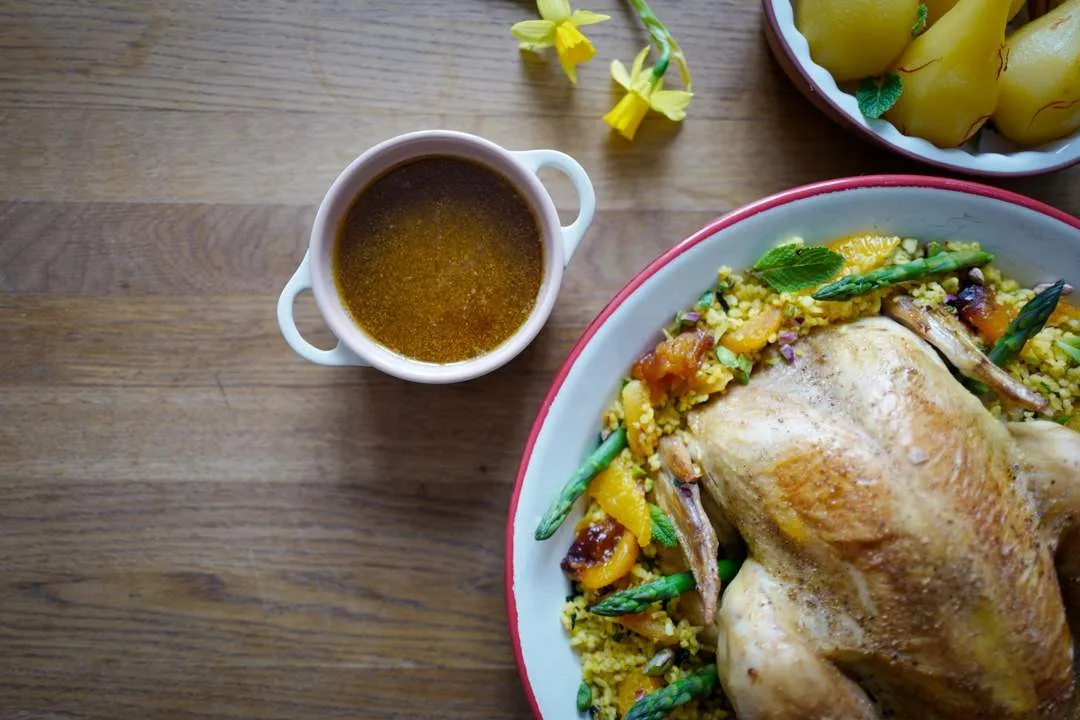 Skyen fra kyllingen koker du opp og sper på med litt god kyllingfond. Ikke for mye for da ødelegger du den deilige kraften som allerede er der fra kylling, aprikoser, kanel og appelsin. Smak til litt og litt til du er fornøyd.