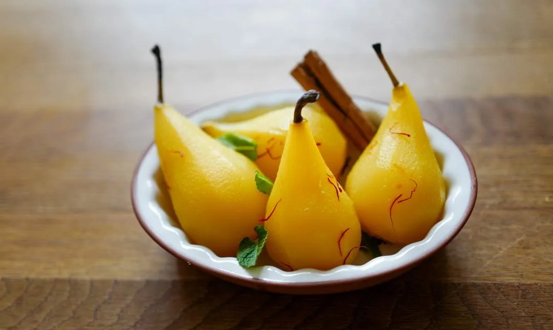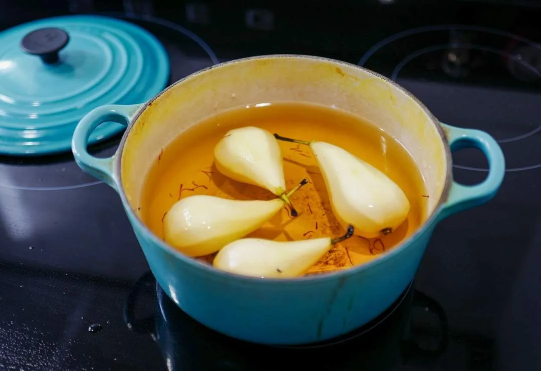 - Pærene: Skrell pærene forsiktig og legg dem i en gryte. Hell på 1 liter eplejuice og noen tråder safran. Kok opp og senk så temperaturen til medium minus og la pærene trekke til de er møre, ca 1 time.
