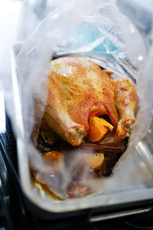 Jeg vasker og tørker kyllingen godt før jeg krydrer fuglen og legger den i stekepose med brystet opp med en halv appelsin i buken og en halv pose tørkede aprikoser og en kanelstang i stekeposen. 1 glass vann og så er det sengeleggetid for kyllingen i 1 time og 20 minutter på 180 grader.
