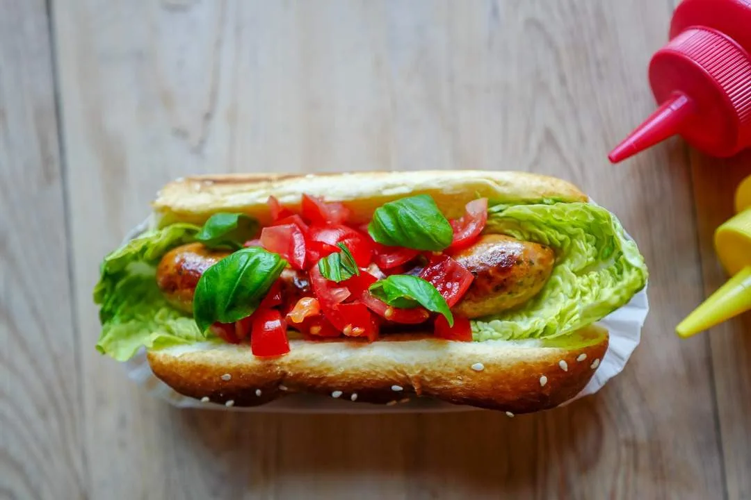 Italiensk landpølse inneholder blant annet litt soltørket tomat noe som gjør at den passe kjempegodt til italienske ingredienser som tomater og basilikum. Jeg har brukt små, solmodne cherrytomater. Del dem i to og klem ut kjernene. Så grovhakker du tomatene og har dem på pølsen sammen med hakket basilikum. Du kan bruke en sterk sennep og ketchup i tillegg hvis du ønsker det.