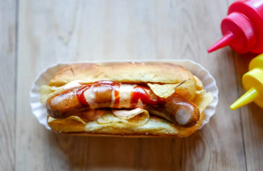 Baconpølse er kjøttfulle og deilige saker. Her blir jeg litt harry og bruker potetgull (for å få masse krønsj) sammen med pølsen i tillegg til en enkel chilidressing. Den lager du enkelt ved å blande en halv boks rømme med 2 ss ketchup, valgfri chilisaus (jeg liker sriracha) etter smak, noen dråper sitronsaft og et presset hvitløksfedd. Så godt!Du kan ha ekstra chilisaus på toppen av chilidressingen hvis du er ekstra glad i sterk mat.