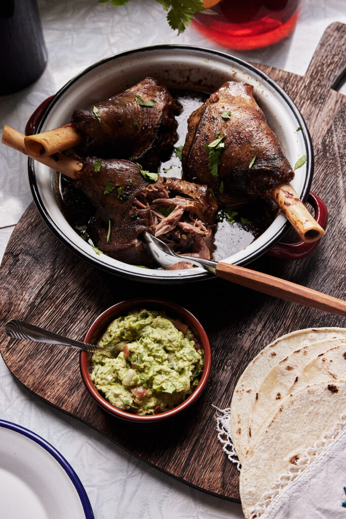 Bland spiskummen, oregano og salt og gni lammeskankene inn med blandingen. Bruk en ildfast gryte med lokk. Ha 2 spiseskjeer olje i gryten og brun kjøttet. Tilsett kraft, appelsinskall, eddik, laurbærblader, hele chilier, hele hvitløksfedd og løk delt i fire båter. Ha på lokk og sett gryten midt i ovnen på 125 °C. La det stå i 4 timer til kjøttet lett faller fra beina når du bruker to gafler til å rive det opp. Sil kraften. Øs noen skjeer kraft over kjøttet for å holde det saftig. Serveringstips fra boka TACO!