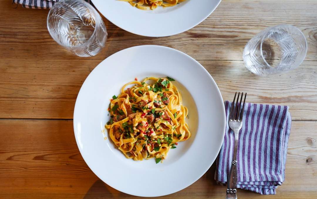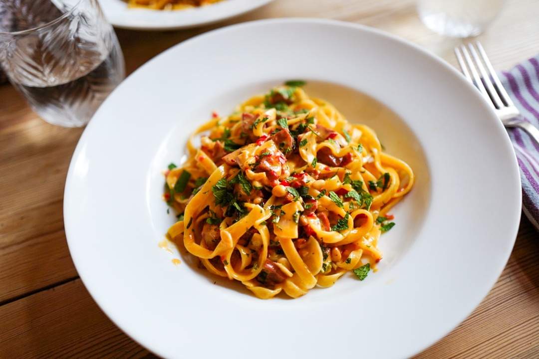 Retten er en enkel tagliatelle-pasta med chorizo, paprika, hvitløk, fløte, mynte og ristede pinjekjerner. Rett og slett en restepasta med ingredienser som måtte brukes opp. Det er ikke slik at ting er kastet tilfeldig i gryta, altså. Alle disse ingrediensene passer veldig godt sammen.