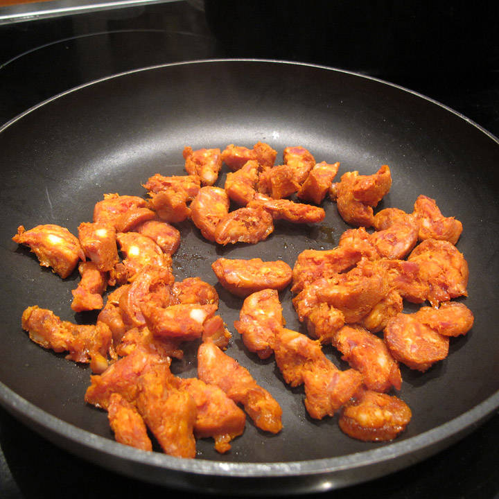 Skjær fersk chorizopølse i skiver. Bruk ca 100 g til to personer. Stek det i en panne. Ta vare på oljen fra pølsen og brukt den til å steke poteter i.