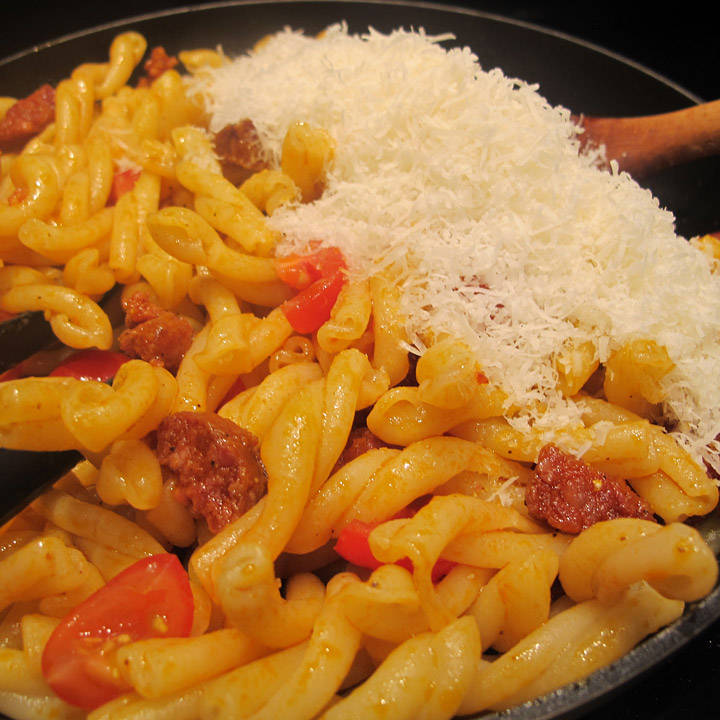 Chorizo er pølsen man alltid må ha i kjøleskapet. Den er perfekt i de fleste retter. Ja, til og med til torsk. Men denne gang ble den et perfekt følge i en pastarett som jeg tidligere har laget, men den gang med bacon.