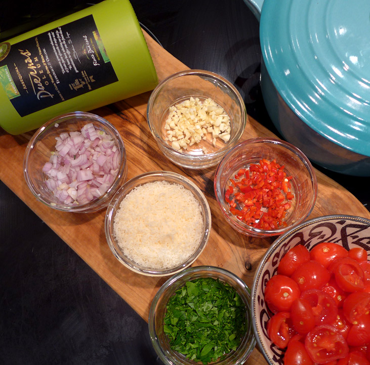 Hell av pastavannet og legg pastaen over i gryten med tomatblandingen. Dryss over parmesan og resten av persillen og bland forsiktig. Hell over litt mer god olivenolje og server i dype tallerkner.
