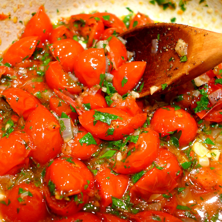 Ta en liten øse av pastavannet over i gryta med løken. (ca 1/2 dl). Tilsett tomatene og litt av persillen. Tomatene skal ikke moses, så la dette stå på lav varme. Salt og pepre.