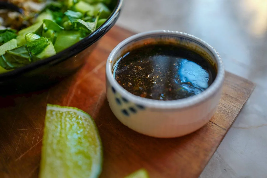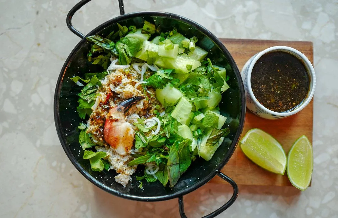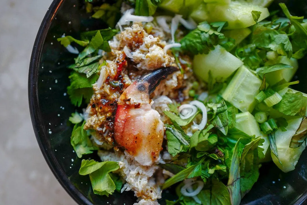 Jeg la kjøttet fra et ferdigrenset krabbeskjell i en skål. Så skrelte jeg en agurk og fjernet den våte delen i midten før jeg skar biter av agurken og la i skålen sammen med krabben. Jeg grovhakket koriander og thaibasilikum (gir god anissmak) og strødde over. Det sammen gjorde jeg med vårløk. Jeg presset litt limesaft over salatdelen og serverte peppersausen ved siden av slik at jeg kunne krydre krabben etterhvert som jeg spiste. Det var skikkelig snadder!