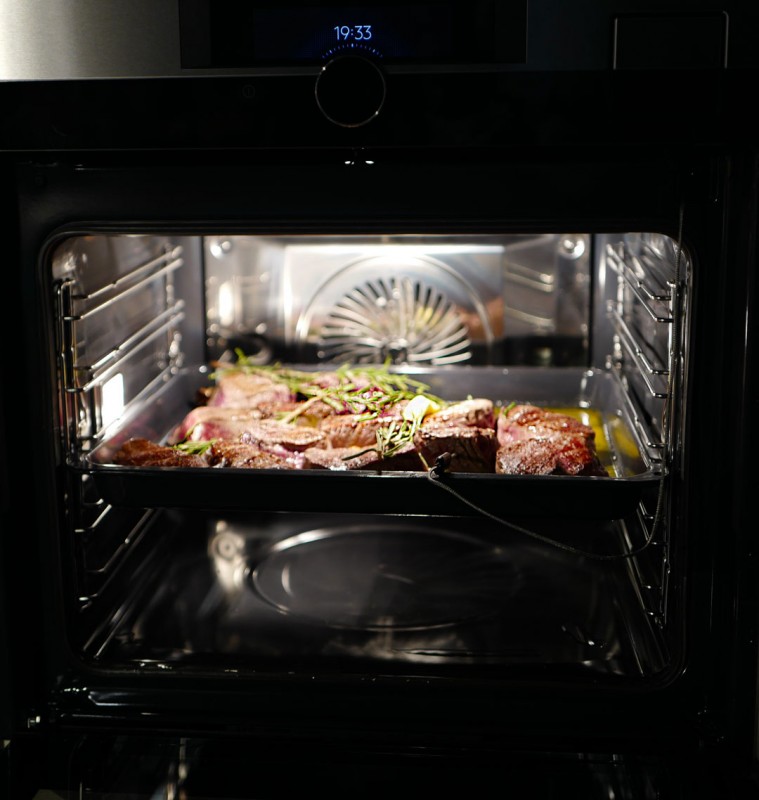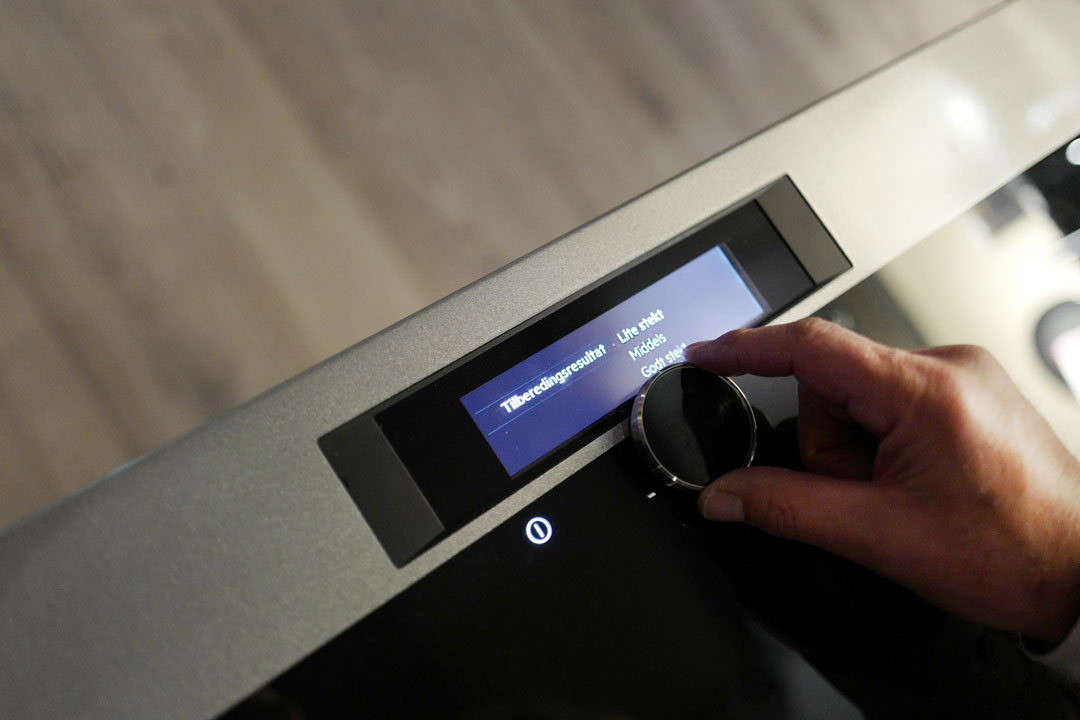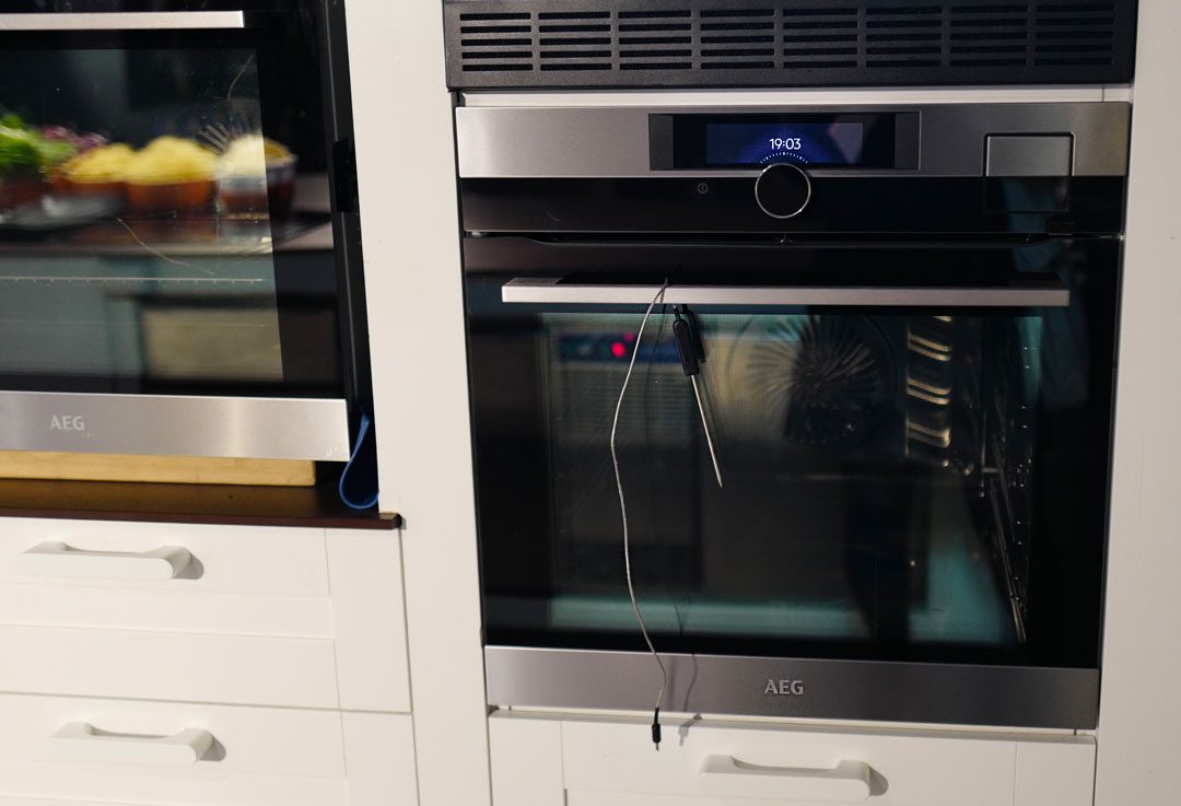 Vi får demonstrert et fancy tilbehør til ovnen, som jeg tenker slår an hos de som er teknikkfreakes med penger. Kort fortalt: Det er et kvadratisk bord med to neonrøde kryss på glassplaten. Her kan to personer sitter og spise mens de styrer temperaturen og innstillingen på ovnen som befinner seg på kjøkkenet. Du kan si at maten lager seg selv mens du har full kontroll ved bordet. Står temperaturen innstilt på riktig innstilling skal altså biffen klare seg selv mens du sitter å hygger deg. Men det er altså ingen som setter kjøttet i ovnen eller tar det ut for deg. Det må du takk og pris gjøre selv. Jeg sier takk og pris, fordi jeg er opptatt av nærhet og kontakt med råvarene.