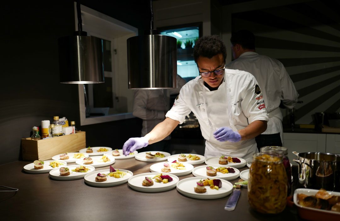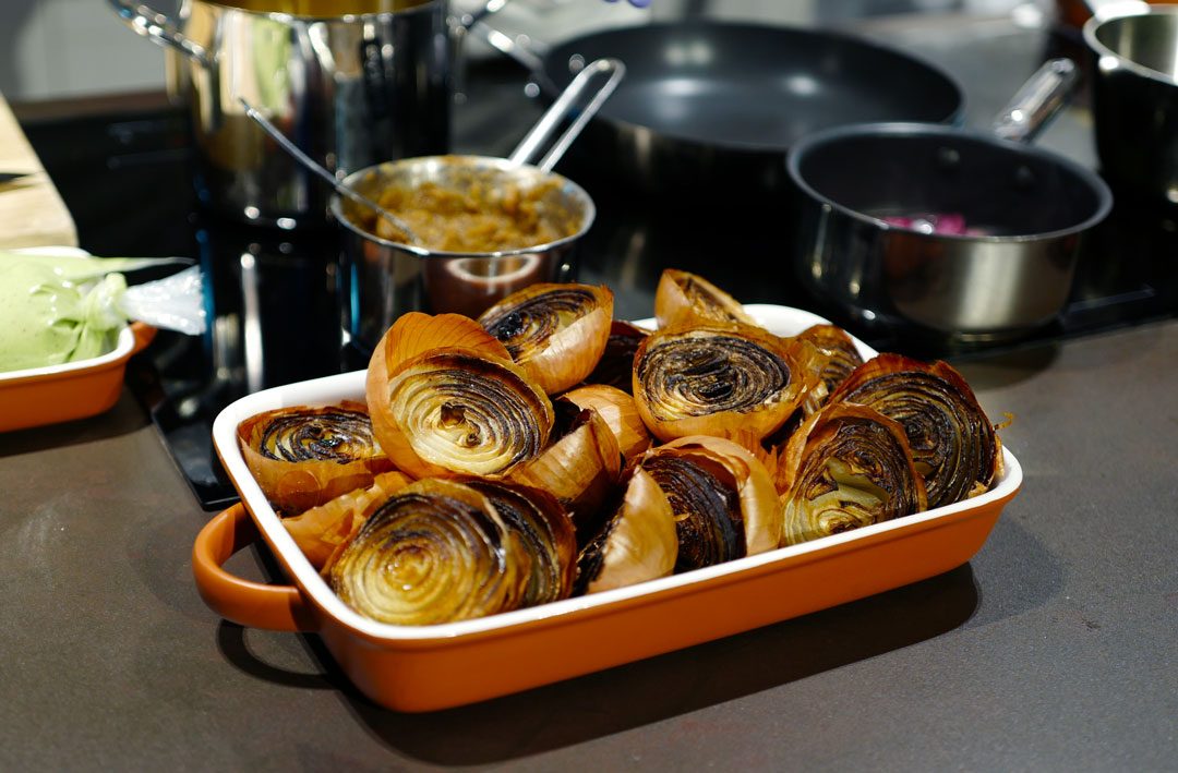 Vi som er tilstede har valgt favorittingrediensene våre og kokkene skal nå lage tilbehør av dette til oksekjøttet. Det kan jo være utfordrende når listen spenner fra asparges via løk og til rødbeter. Men kokkene tar dette på strak arm og tryller frem den lekreste rett.