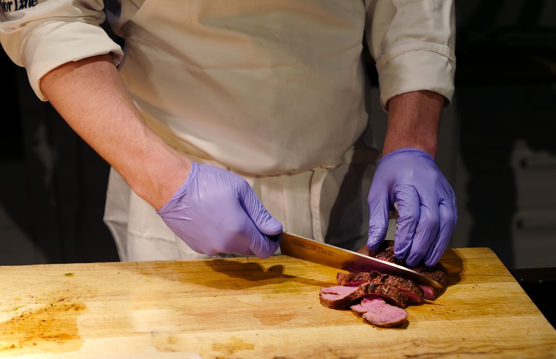 Tiden er inne for å sette seg til bords og Tor og Michael serverer en flott tallerken med perfekt stekt indrefilet av okse med nydelig tilbehør. Det blir stille rundt bordet. Kniven beveges seg gjennom kjøttet helt uten motstand. Dette er møre saker.
