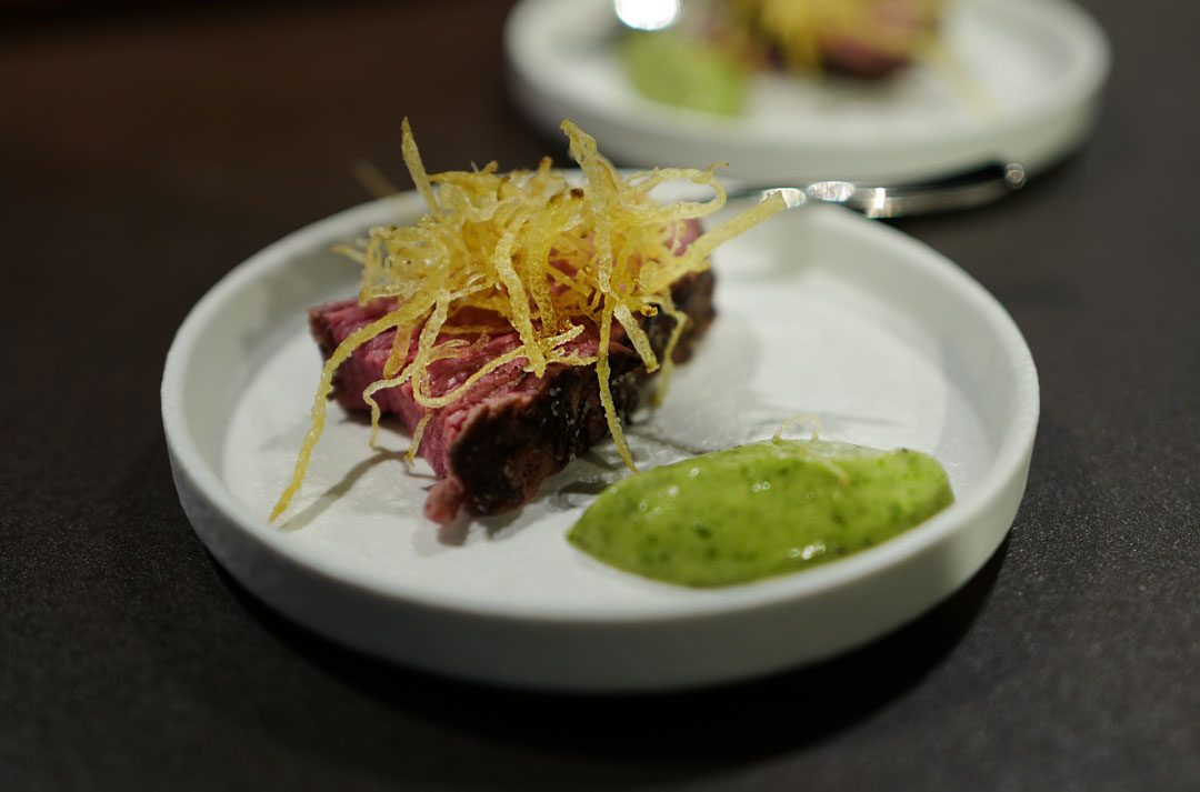 Det er ikke bare en rett. Vi får først servert et helt nydelig stykke entrecôte tilberedt sous vide. Den er ikke sous videt i vannbad, men i AEGs dampovn, så det går også an med vidunderovnen som jeg skulle ønske jeg hadde på kjøkkenet mitt. Kjøttet smelter på tungen, og med den herlige, hjemmelagde estragonmajonesen til kjøttet, og sprø potetkrøsnj på toppen er dette den perfekte forretten før selve indrefilet kommer på bordet.