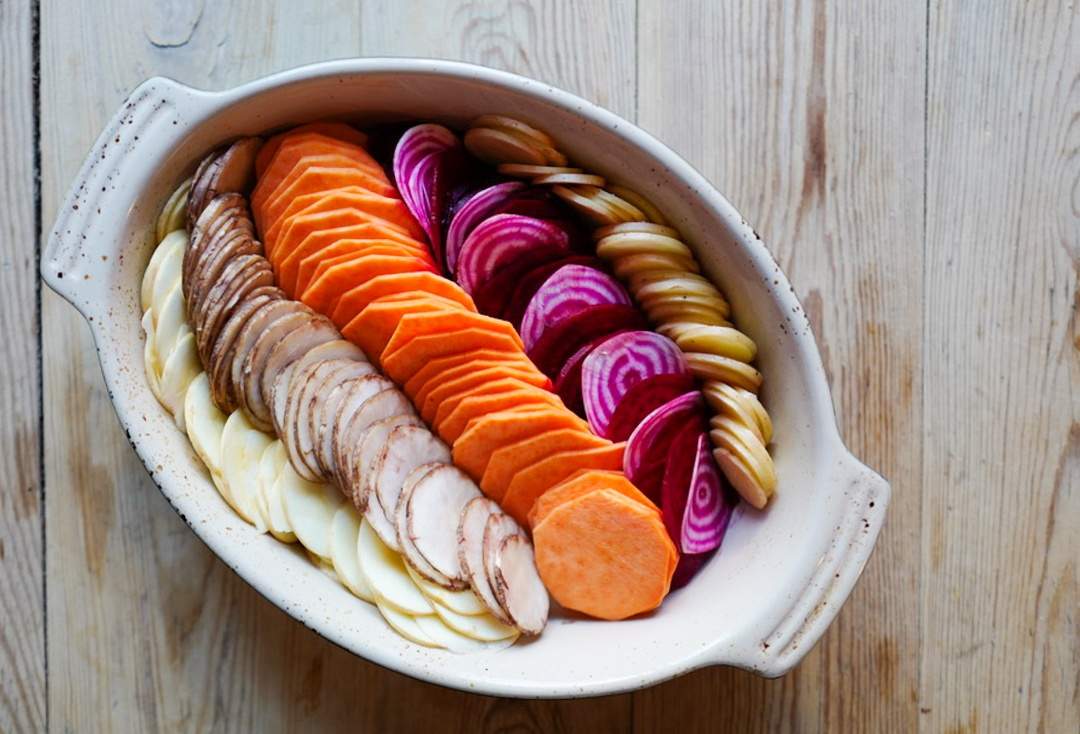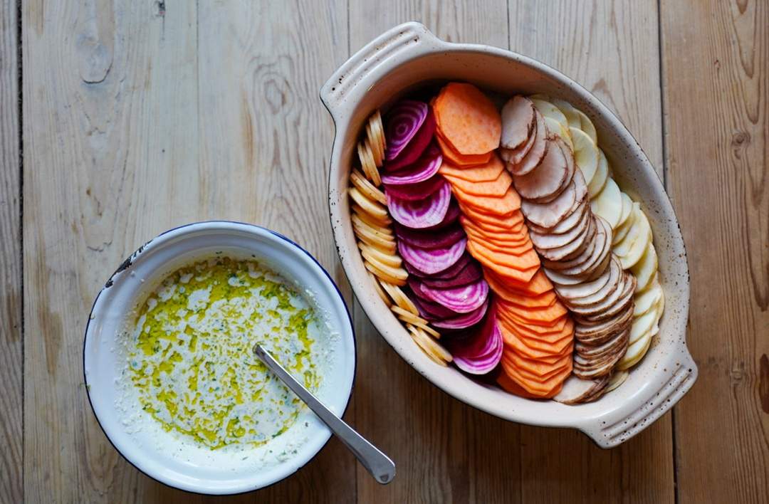 Start med grønnsakene. Har du en mandolin er det nå du skal ta den frem. Pass på fingertuppene... Vask og tørk alle grønnsakene. Jordskokk, pastinakk og poteter trenger du ikke skrelle. Skjær alle grønnsakene i tynne skiver. Alle grønnsakene må være like tynne for at retten skal bli ferdig på samme tidspunkt. Har du ikke mandolin bruker du siden på et rivjern. Legg rødbetene for seg selv for de farger av på alt! Nå kan du begynne å lage formen. Smør med litt olje og så legger du striper med skiver av grønnsaker. Legg rødbetene langt ut mot kanten slik at fargene ikke blander seg. Du kan godt ha de små potetene lengst mot kanten som nabo til rødbetene. Min rekkefølge er: pastinakk, jordskokk, søtpotet, rødbeter (med innslag av polkabeter) og poteter. Legg den tørkede soppen i 3 dl lunket vann i 15 minutter. ta ut soppen og klem vannet ut av den. Grovhakk soppen og legg til sides halvparten som du steker i pannen med litt smør, hvitløk og persille som du serverer til kyllingen. Behold vannet som soppen har ligget i. Dette er rett og slett en helt nydelig kraft og du skal bruke litt av den i grønnsaksformen. Bland sammen fløte, soppkraft, hvitløk, hakket sopp, parmesan, timian, litt salt og pepper. Hell det over grønnsakene og sett i ovnen på 180 grader i ca 40 minutter eller til grønnsakene er møre. Det kjenner du etter med en knivspiss. Det er pastinakk og jordskokk som bruker lengst tid på å bli ferdig. Ta kyllingen ut av pakken og legg filetene i en ildfast form med skinnet opp og sett i ovnen på 180 grader eller i en panne med skinnsiden ned på medium pluss temperatur for å brune skinnet litt og for å varme kyllingen. Stek resten av soppen med hvitløk og persille noen minutter. Skjær kyllingbrystene i skiver og server med sopp og regnbue-grønnsaker. Garantert lykke! Perfekt kylling med sopp og regnbue-grønnsaker