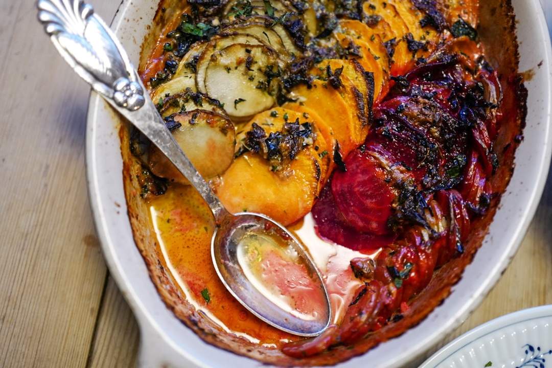 Jeg bruker rotfrukter og tørket sopp fordi vi fremdeles har dette å kose oss med før våren og forsommeren setter fart i årets nye vekster.