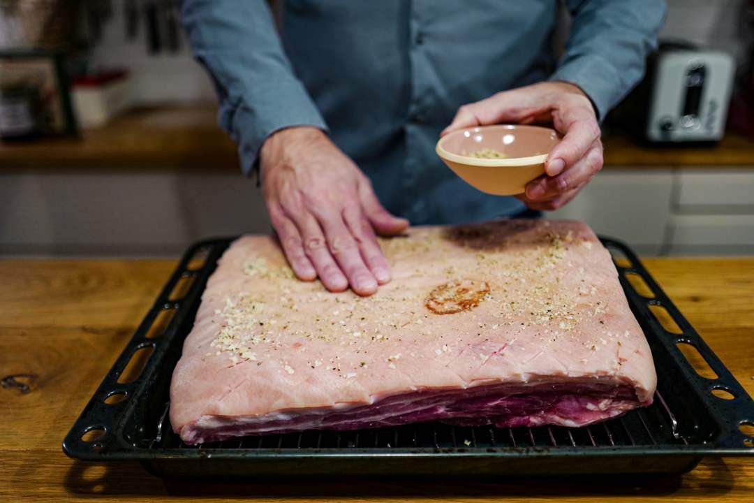 Så gnir jeg denne blandingen inn i ribbe og svor (dvs. Det er Erik som gjør det denne gangen, for han skal jo lære dette med ribbesteking). Han sørger for å gni godt inn i sprekker på svoren, sidene og på undersiden av ribben. Så settes ribben på rist i langpanne.