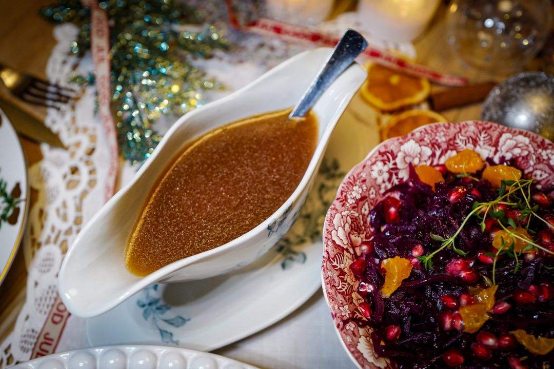 Smak på kraften. Er den kraftig i smak, tynner du den ut med litt vann. Kok opp og tilsett en skvett portvin hvis du vil. Det gir en helt fantastisk smak til sausen.
