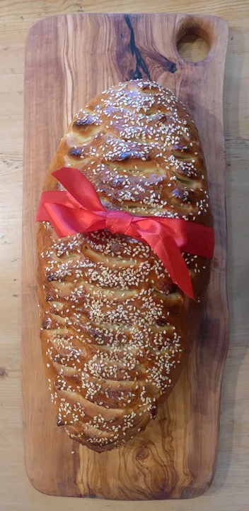Ta deigen ut og elt den litt for hånd og form til et stort brød eller to mindre. Pensle med det sammenpisket egg og klipp snitt i brødet med en saks for å få fint mønster. Strø sesamfrø over.