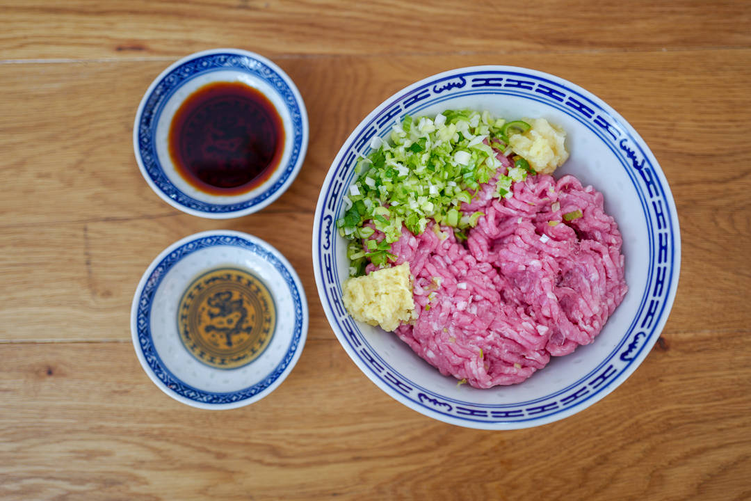 Selve gyozadeigen har jeg laget av svinekjøttdeig, vårløk, masse revet ingefær og hvitløk. Den er krydret med soyasaus og sesamolje. Da trenger du ikke salt. Mange bruker strimlet kål i deigen. Det er også godt. Du kan også bruke finhakket sopp. Dette velger du helt selv.