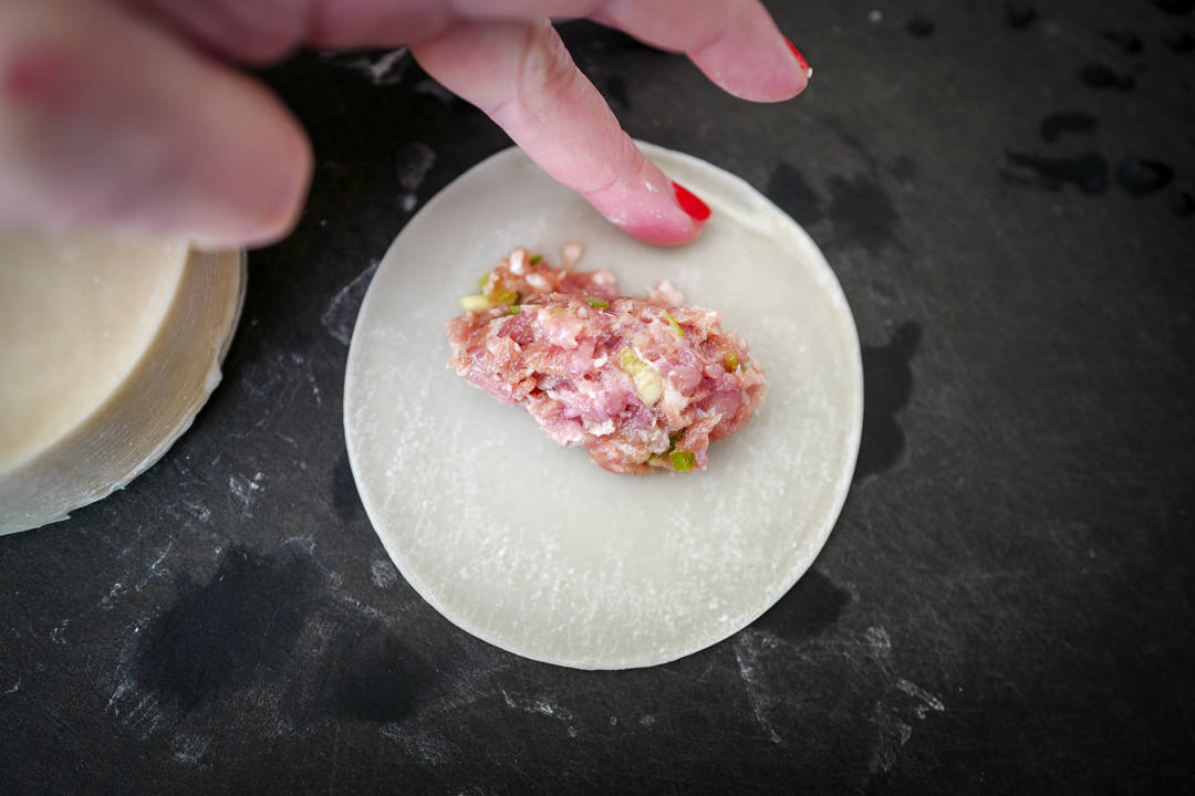 Bland sammen og legg en toppet teskje med fyll midt på gyozadeigen.