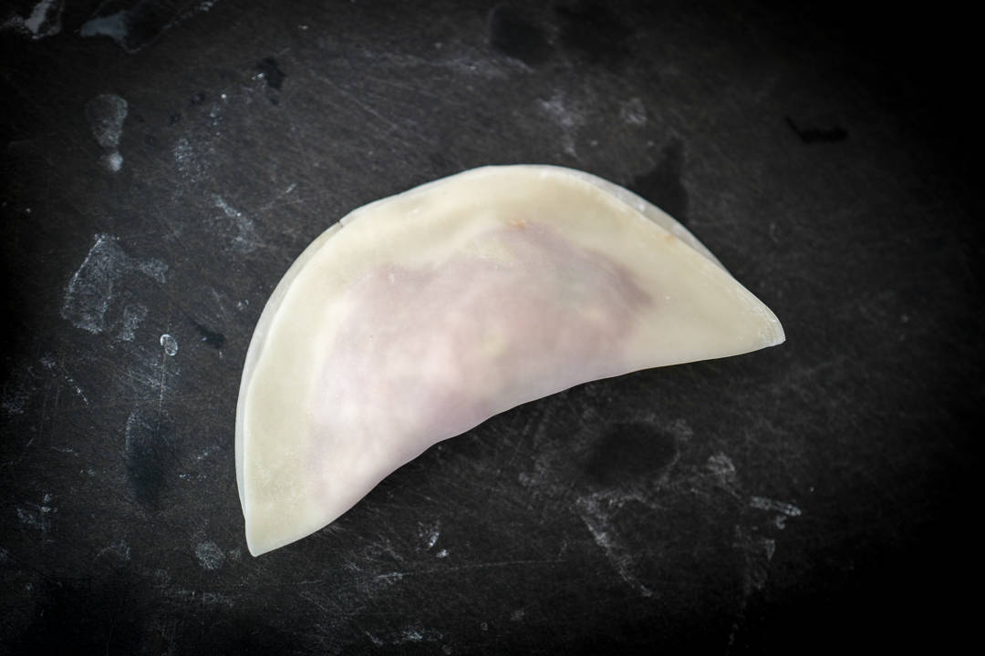 Ha en skål med vann ved din side. Med en finger fukter du den ene halvdelen av kanten på gyozadeigen. Brett over slik at du får en halvmåne og press fyllet forsiktig slik at det ligger inne i deigen uten lufthullet.