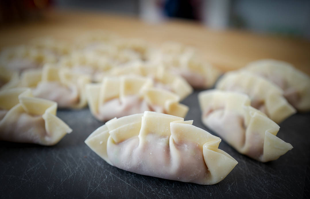 Nå har du laget din første gyoza! Legg de ferdige gyozaene på en tør flate. Legg plast over slik at de ikke tørket ut.