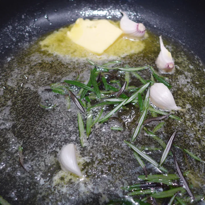 Varm en panne med masse olivenolje (3 ss) og masse smør (3 ss). La dette fylle et tykt lag av bunnen på pannen når det er i smeltet tilstand. Tilsett 3-4 hvitløksfedd (helst ferske) som du har gitt et lite kakk med siden på en kniv for at hvitløken skal gi smak til oljen og smøret. Legg et par grener rosmarin i pannen og tilsett potetbitene. Stek dem slik at de blir sprø på utsiden. Du kan velge å servere dem nå eller sette dem i ovnen på 250 grader i 15 minutter. Jeg gjorde det. Nå har du deilige poteter som er sprø på utsiden og myke som potetmos på innsiden.