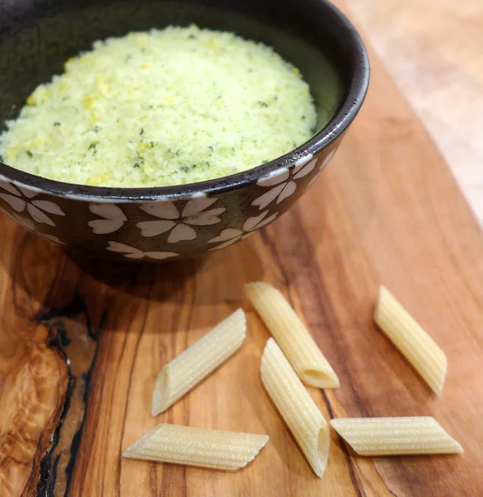 Nyrevet parmesan på en pastarett er en selvfølge på mitt kjøkken. Det hever smaken, rett og slett. Men for å gjøre parmesanen hakket mer spennende kan du tilsette revet sitronskall og urter. Jeg hadde en deilig kyllingpastarett forleden dag og lagde en skål med parmesan, sitronskall og estragon. Dette kan du også gjøre enkelt ved å ha en bit parmesan i blenderen sammen en liten remse sitronskall (bruk potetskrelleren) og en liten neve urter. Basilikum er fantastisk hvis du har en tomatbasert pastarett. Estragon passer fint f.eks sammen med kylling.