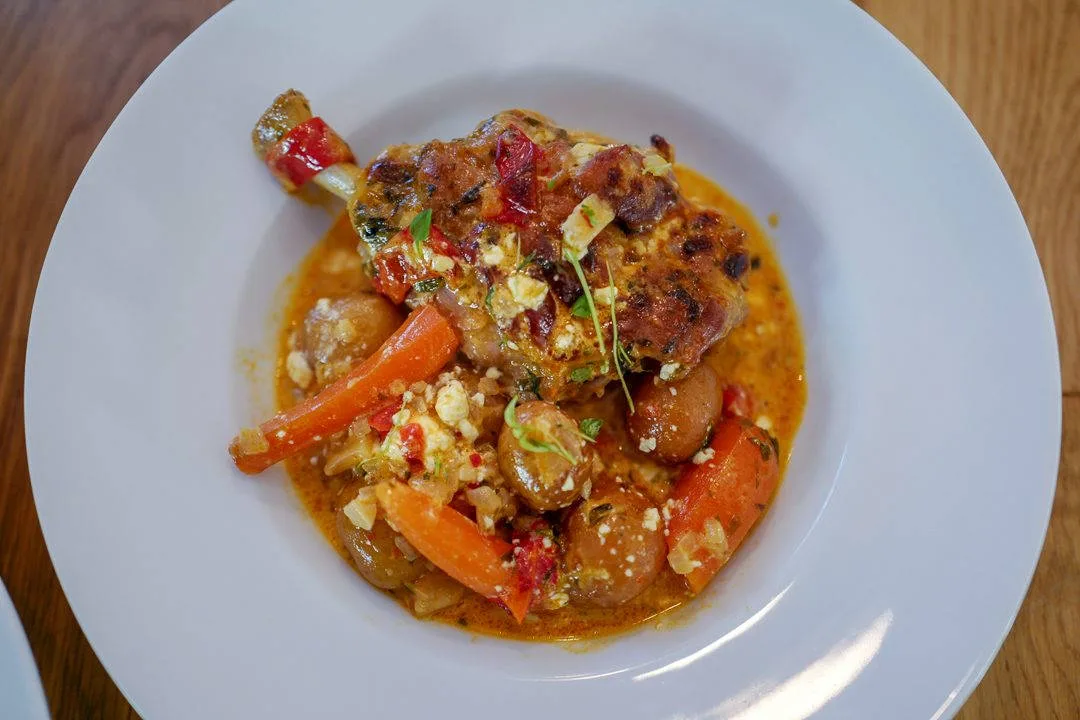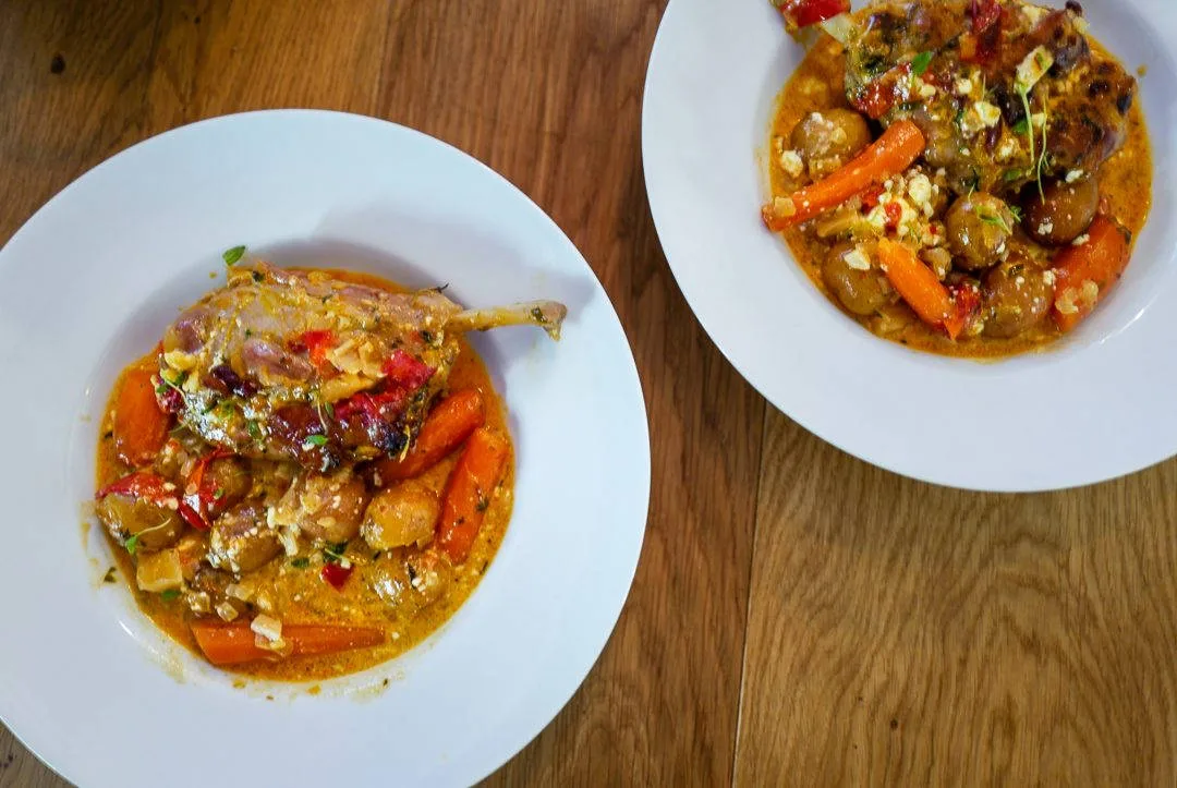Skuff dette til siden og legg pig wings i gryten. La disse brunes litt før du tilsetter pastis (eller vin) og la alkoholen dampe av før du legger i poteter og laurbærblad. Hell på vann slik at det dekker (ca 2-3 dl) og tilsett crème fraîche og estragon. Kok opp og senk temperaturen til medium og sett på lokk. La stå en time. Så tar du av lokket og tilsetter gulrot og paprika. Sett på lokk og sett i ovnen på 200 grader i 30 minutter. Ta av lokket og la stå i nok en halvtime. Smak til om gryta trenger mer salt eller pepper. Skvis evt litt sitronsaft over gryten før servering.