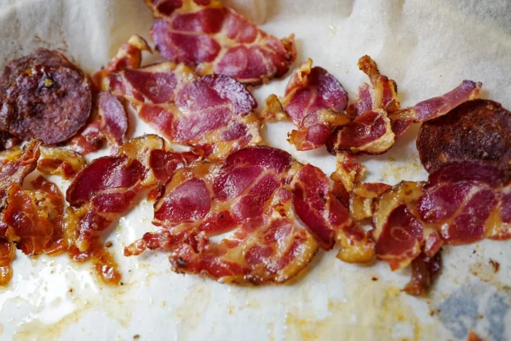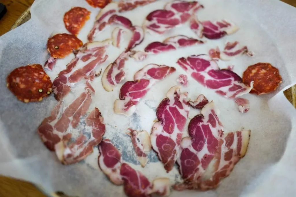 Det du gjør er å skjære tynne skiver av spekemat som du har til overs. Jeg brukte coppa-skinke og skiver av «Slegge» (salame picante). Begge fra Ask Gård. Skivene la jeg på bakepapir og stekte i ovnen på 220 grader til du kan smuldre skinke og spekepølsen mellom fingrene.