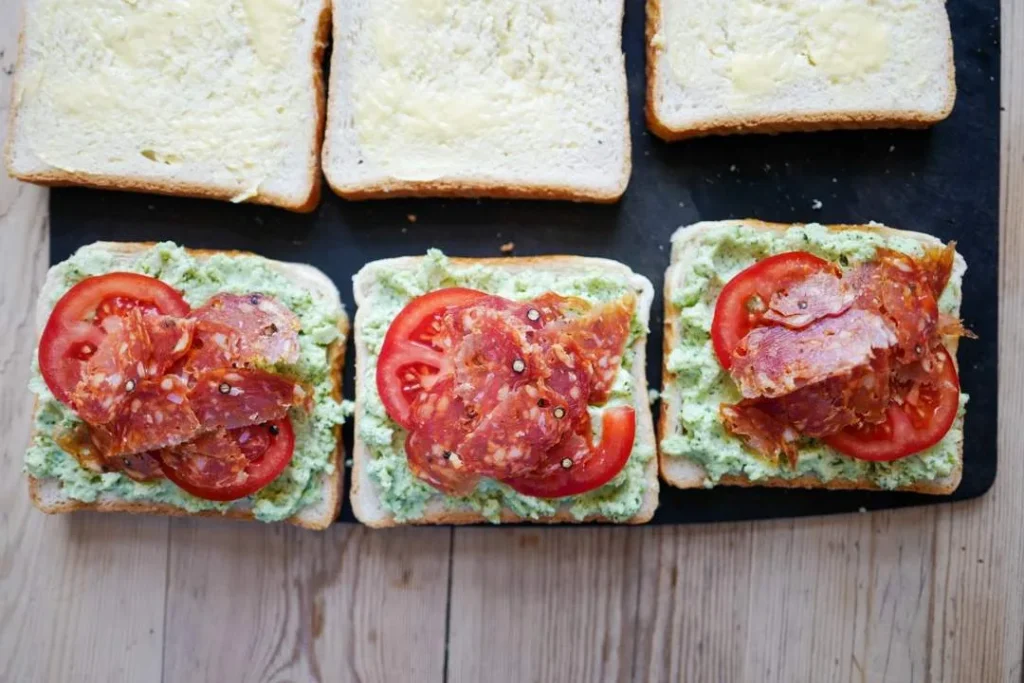 Fordel grønn mozzarella over tre skiver (de uten smør) og legg på tomtskive og salami. Legg på den smurte skiven på toppen med smørsiden ut. Stek med smørsiden ned i pannen på medium varme og med et lokk over i noen minutter før du snur smørbrødene. Stek et par minutter og sett så smørbrødene i ovnen på 200 grader til osten har smeltet og smørbrødene er gylne.