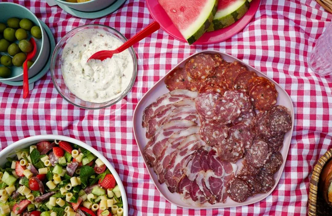 I helgen var det ekte sommermat som sto på menyen. Vannmelon, oliven, porsjonsfocaccia med salami og rosmarin, nypoteter med spekemat-krem, pastasalat med jordbær og spekepølse, grillspyd med chorizo og ananas, spekefat og Caprese-ostesmørbrød med mozzarella, tomat, basilikum og salami picante. Tror du vi koste oss eller?
