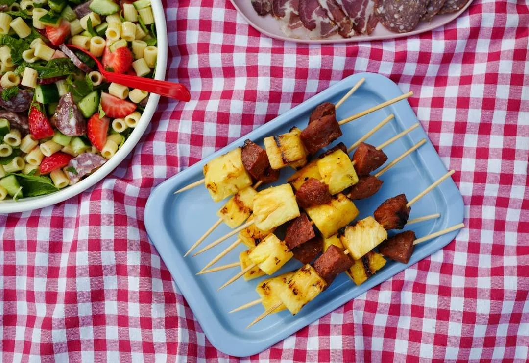 Tre annenhver bit ananas og chorizo på grillspyd og grill dem slik at ananasen blir enda søtere og chorizoen karamelliseres og er varm tvers igjennom.