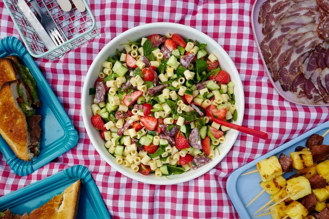 Pastasalat med jordbær, spekepølse og dressing med honning og ingefær