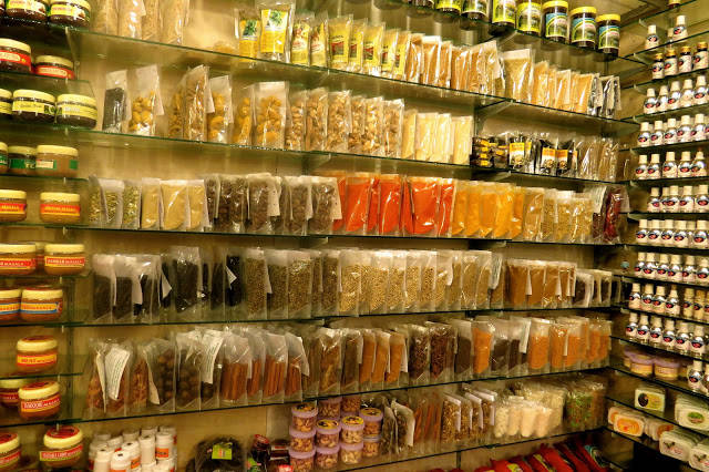 | Krydderbutikk på Spice Road i Kochi. Vakumpakkede, økologiske krydder av beste kvalitet. |