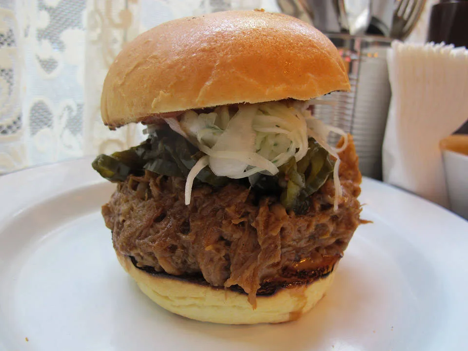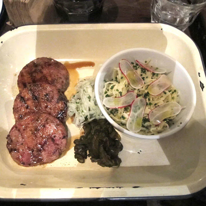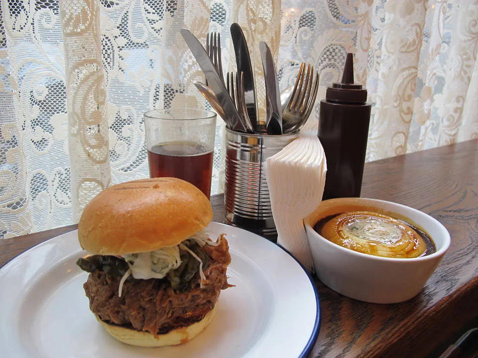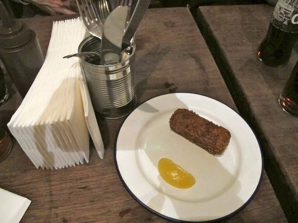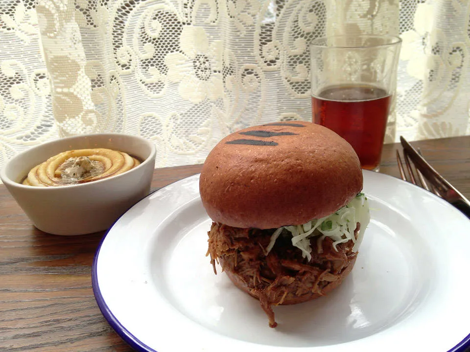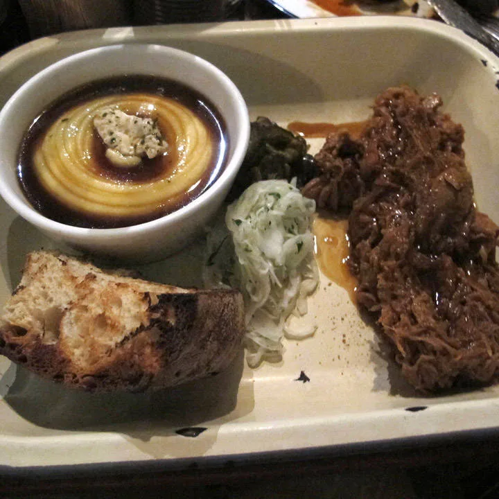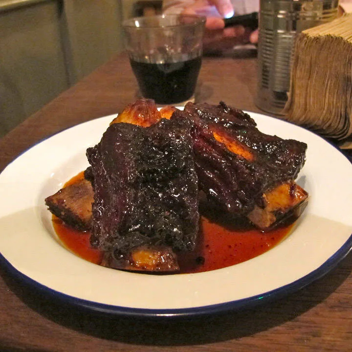 Jeg fikk en av de få sitteplassene i første etasje. Hip hop-musikk dundrer over anlegget. Jeg bestiller retten jeg har drømt om helt siden jeg booket flybillett til London: Pulled Pork Bun med Marrow Mash. Jeg har store forventninger til dette, og når retten kommer foran meg på bordet, og jeg setter tennene i den, smelter hele mitt kalde vestkanthjerte. Det blir ikke bedre enn dette! Saftig smelte-på-tunga-kjøtt blandet med deilig saus. Hamburgerbrødene er smurt med hjemmelaget majones, hjemmesyltede agurker som minner om de mormor lagde, sprø coleslaw med spennende krydder. På siden tar jeg litt av husets herlige ketchup med sterk smak av selleri. Vi snakker Bloody Mary-ketchup. For en smak! Bone Marrow Mashen er som krem. Helt perfekt. Sterke smaker av urter og saus som sitter som et skudd. Jeg er yr av lykke og skulle ønske jeg var der sammen med noen for virkelig å skrike ut min begeistring. Kanskje tatt et glass Bourbon også, noe de har mye av på Pitt Cue.