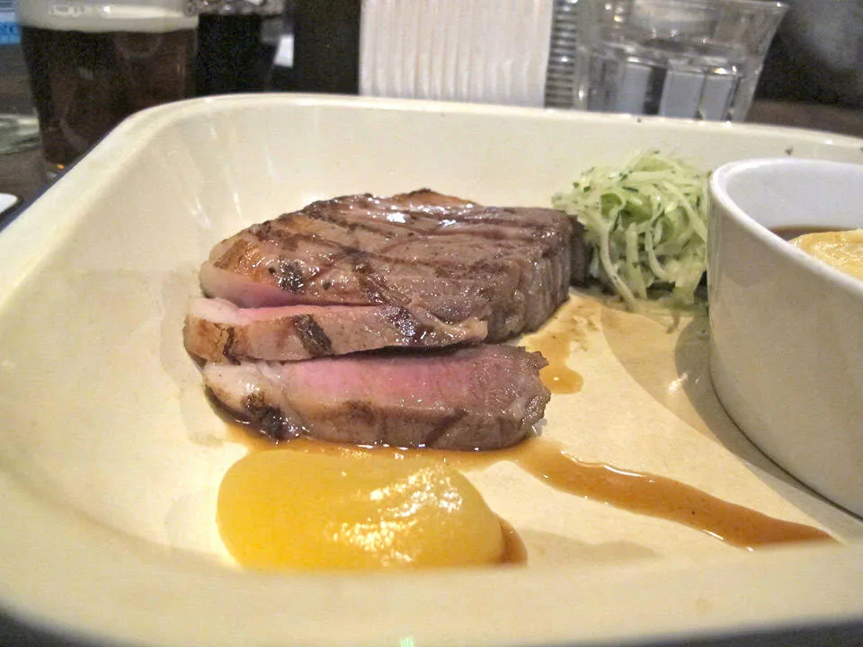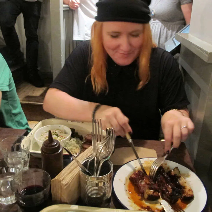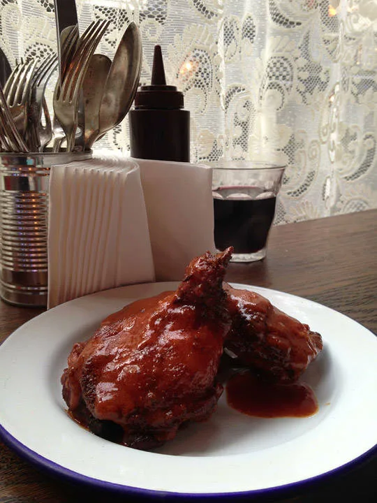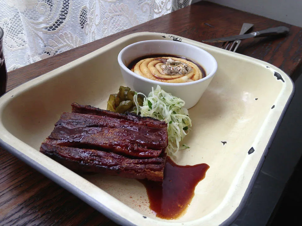 …Så bra at jeg returnerte to dager senere sammen med Erik, min mann. Vi sto klare som første personer i køen da de åpnet dørene søndag formiddag. Utenfor i regnet seg røyken ut fra kjøkkenet. Vi var klare for megalunsj. Menyen er litt anderledes fra fredag. Vi fikk plass i kjelleren og bestilte først røkte okseribben i karamellchilisaus. Erik bestilte Pulled Pork i stor porsjon med Bone Marrow Mash. Jeg gikk for husets egen Pig’s Head Sausage med chili coleslaw. Øl og rødvin i glass. De har enten rød- eller hvitvin. No fuzz. Erik smelter ned i gulvet av lykke. Jeg er like begeistret som første gang. Dette er gutta som kan lage mat! Okseribbeina er helt fenomenale, og karamellsausen er spektakulær. Du får lyst å spise den med skje. Coleslawen som jeg får er den beste jeg har smakt i hele mitt liv.