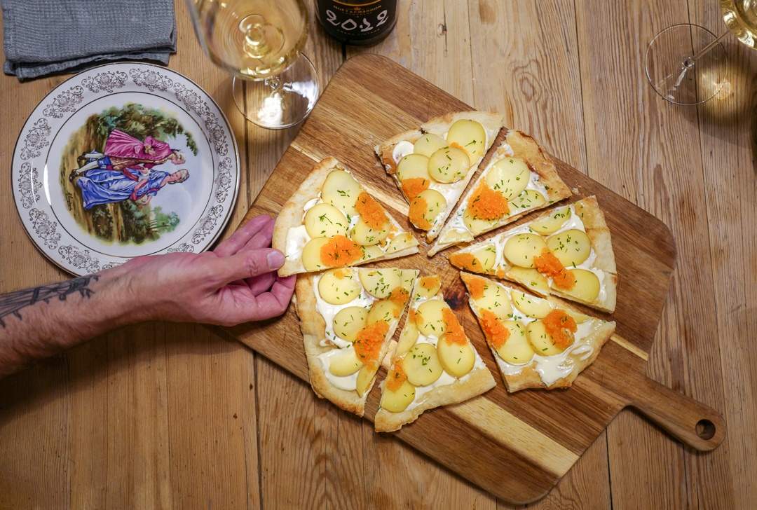 Du lager en helt vanlig, tynn pizzadeig og steker den. Avkjøl den så den er lunken.