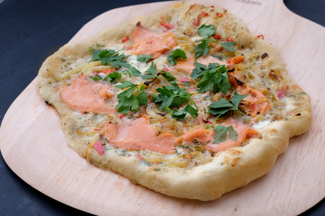 Når du har kjevlet ut deigen legger du ost på. Tilsett gjerne litt revet parmesan for mer smak. Legg på løken og så legger du røkelaksskiver på og et generøst dryss med hakket rød chili. Pensle kanten med olivenolje og stek til den er sprø og herlig. Dryss friske urter på toppen og server.