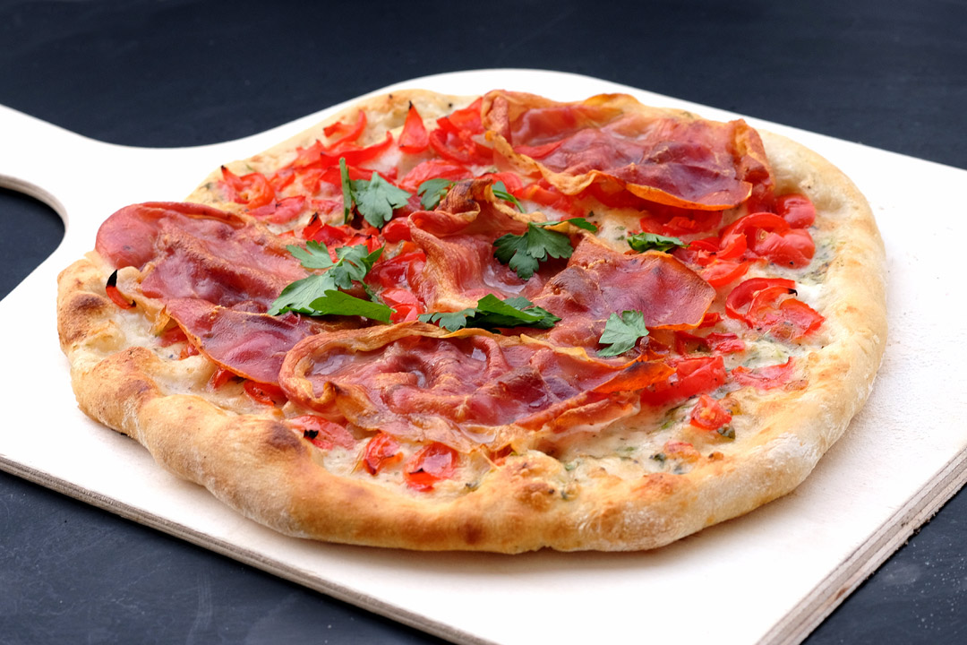 Erik lagde en pizza med ferske tomater og spekeskinke fra Æra. Han brukte samme ostetrikset som meg, og hadde også hakket chili. Tomatene skal han i biter og fjernet kjernene. Spekeskinke på toppen. Nydelig, skal jeg si deg.