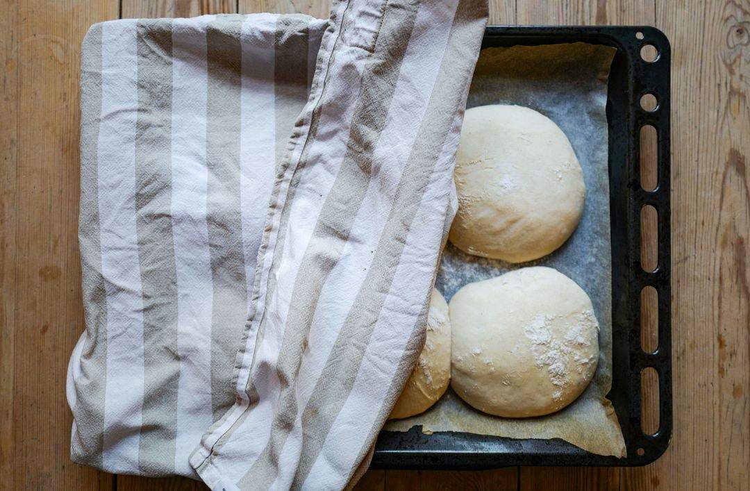 Slå ned deigen (slå ut luften) og del deigen i seks like emner. Legg emnene på et bakebrett eller en beholder. Strø litt mel over og legg et fuktig klede over brettet. Sett kjølig (i kjøleskap eller i en baktrapp, kjølerom…) i minimum 6 timer. Du kan oppbevare disse emnene kjølig et par dager uten problem.